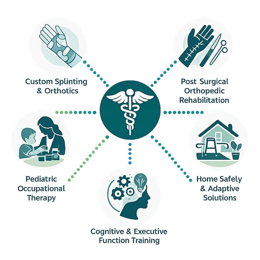 Services span pediatrics through older adulthood, addressing orthopedic injuries, neurological recovery, cognitive and executive functioning challenges, mental health–informed care, and early developmental needs—all under one practice.